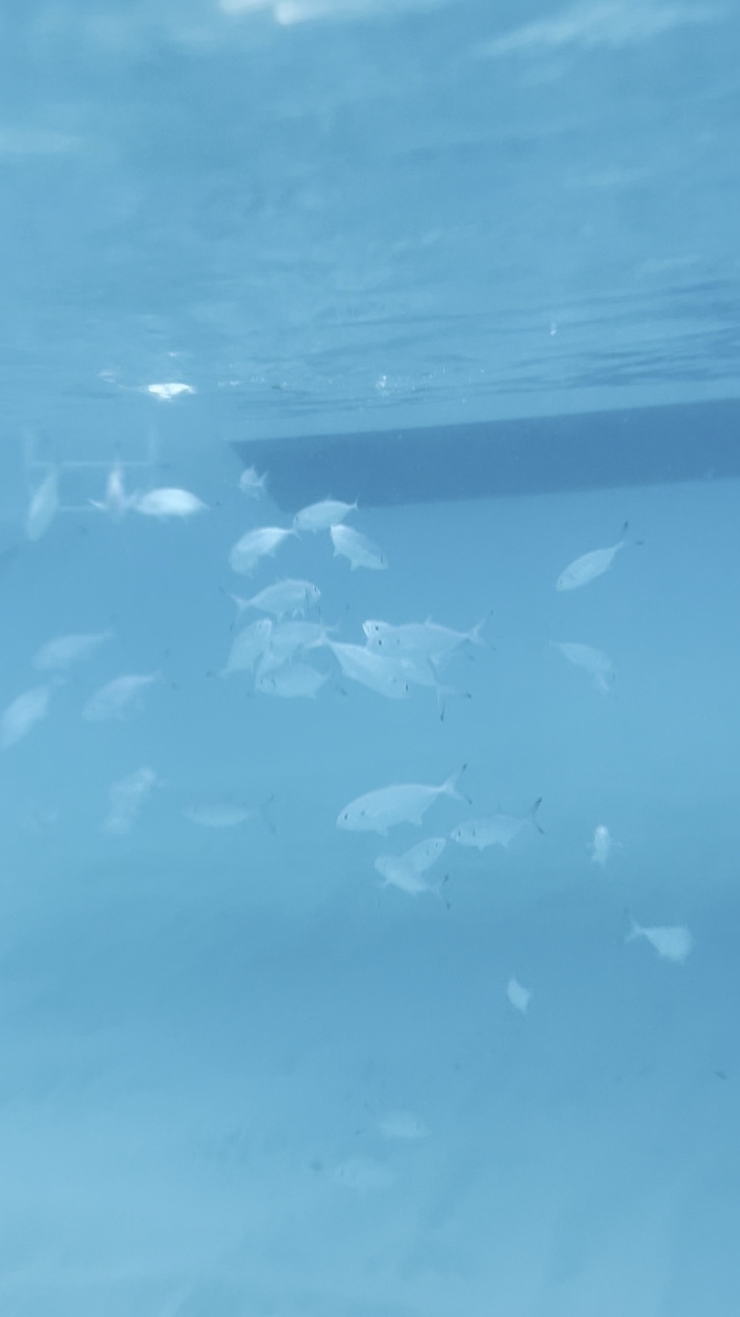 Moments later, a school of fish gathered beneath the boat, swirling through the impossibly clear water as crumbs from lunch drifted down toward them.