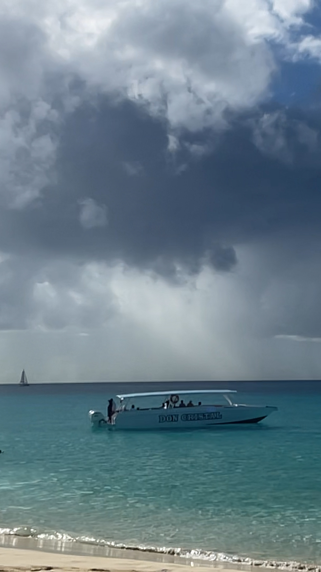 Our final beach stop was Meads Bay, another stunning stretch of Anguilla coastline known for its crystal-clear water and elegant beachfront resorts. By the time we arrived, the pace of the day had softened into something quieter. Darker clouds drifted overhead and shafts of sunlight broke through in glowing rays, illuminating the water around the boat until it looked almost like glass.